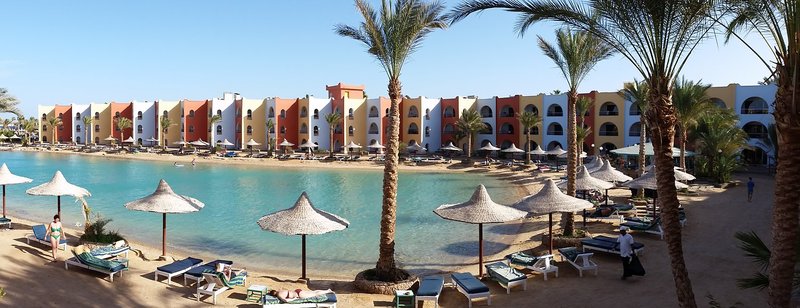 Die Hotelanlage liegt ruhig und direkt am hoteleigenen Strand und hat zwei künstlich angelegte Lagunen. Das vorgelagerte Hausriff eignet sich hervorragend zum Schnorcheln (Badeschuhe empfohlen). Zum Ortszentrum nach Sakala sind es ca. 2 km, nach Hurghada ca. 3 km.