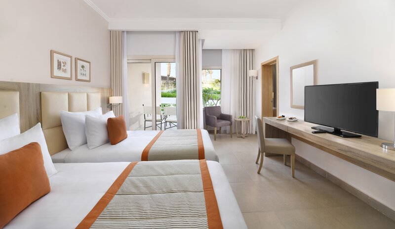 Alle Zimmer sind mit Balkonen oder Terrassen ausgestattet, die auf das Meer, den Garten oder die Pools blicken lassen. Alle Zimmer haben Klimaanlage, Satelliten-TV, Telefon, Safe, Bäder mit Dusche. Eine Mini Bar (gegen Gebühr) sowie Tee- und Kaffee-Zubereitungsmöglichkeit gehören ebenfalls zur Ausstattung. Babybetten auf Anfrage. Es gibt Superior Doppelzimmer mit Gartenblick (DSG/ESG) oder Poolblick (DSP/ESP) sowie Familiensuiten (FSU/FS3).