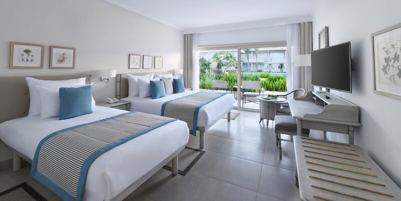 Vse sobe imajo balkone ali terase s pogledom na morje, vrt ali bazene. Vsaka soba vključuje klimatsko napravo, satelitsko televizijo, telefon, sef in kopalnico s tušem. Na voljo sta tudi mini bar (za doplačilo) in oprema za pripravo čaja in kave. Otroške posteljice so na voljo na zahtevo. Na voljo so superior dvoposteljne sobe s pogledom na vrt (DSG/ESG) ali bazen (DSP/ESP) in družinski apartmaji (FSU/FS3).